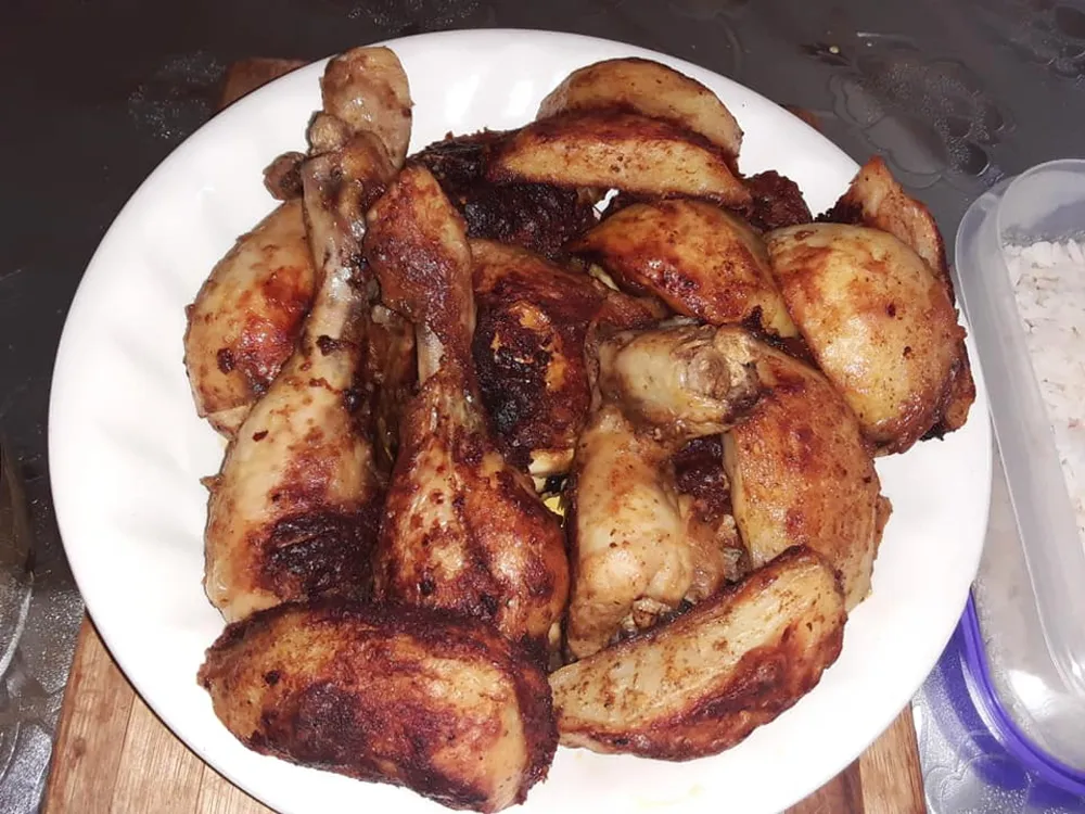 Lightly sprinkle salt on chicken & potatoes & then coat with bbq spice and put into oven roasting pan and bake @180 deg for 1 hr or until chicken is brown and done...