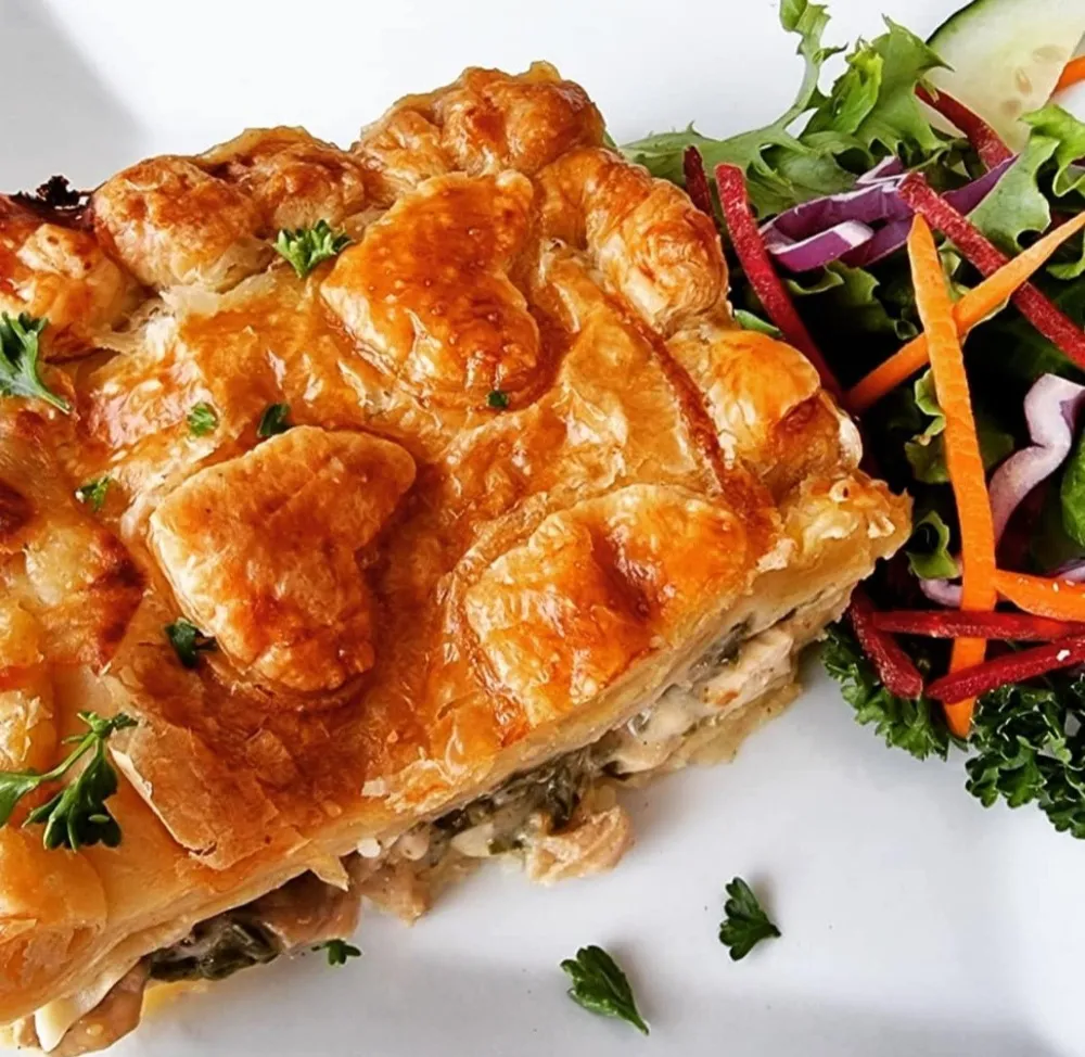 Line the dish with mash, followed by the chicken filling and top with pie pastry. (I unroll the pastry from the packet but do not roll it out further, use it as is...)