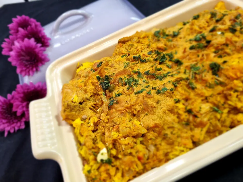 In an oven safe dish add three quarter of the rice, potatoes, eggs, fried onions. Add the chicken and sprinkle over the remaining rice, onions and the masala.