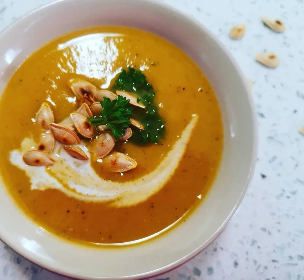 Serve by Garnishing with freshly toasted pumpkin seeds and a sprinkle of fresh coriander.