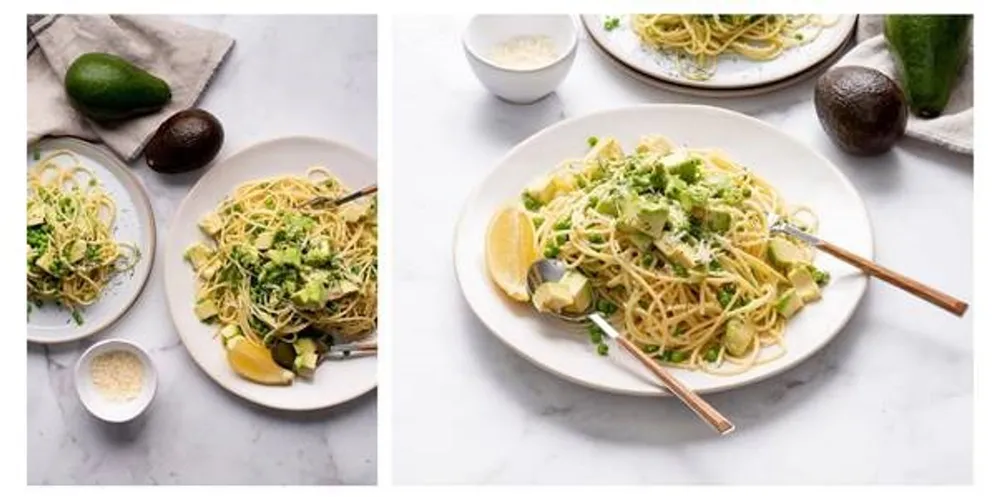 Toss the pasta and peas with diced avocado, and cooking water, stir in the lemon zest and 3 tablespoons of the Parmesan, the reserved cooking water, and the avocado oil.