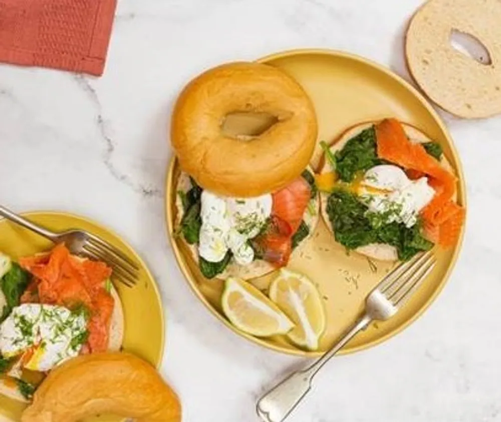 Layer avo, blanched spinach onto the bagel halves, followed by the smoked trout and poached eggs and top with chopped dill.