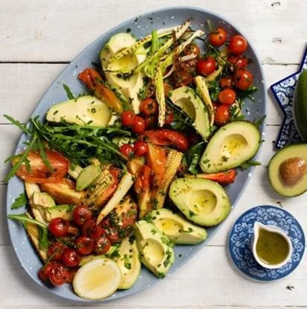 Avocado salad with Roast Tomatoes, Baby Corn, & Spring Onions