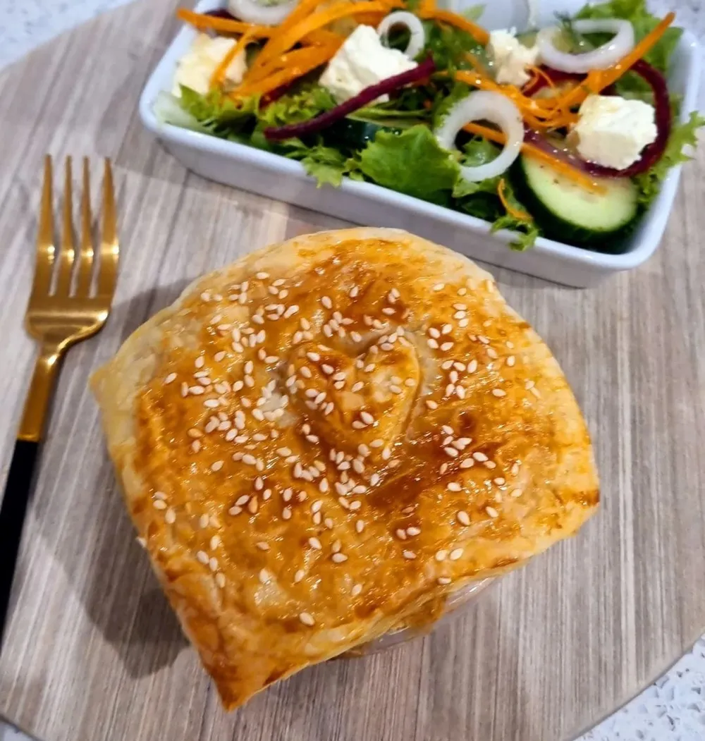 Fill a 10-12cm ramekin with the chicken and mushroom mixture and top with a square sized puff pastry, big enough to cover the top.