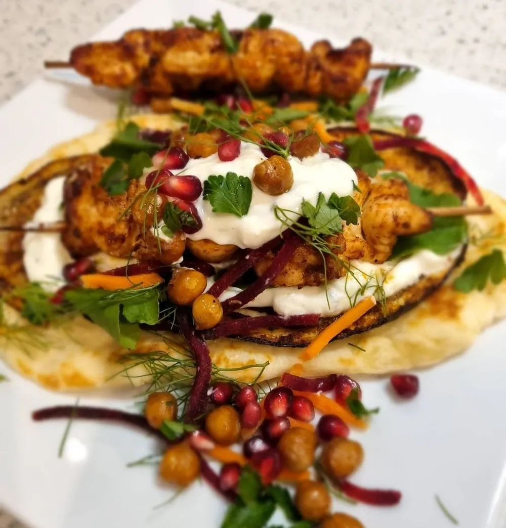 Roll out a roll of pre bought puff pastry and cut into squares. Fry the pastry like roti on a hot dry pan. Add the grilled brinjal, chicken kebabs, chickpeas and veg, herbs and serve as a starter, appetizer or main.