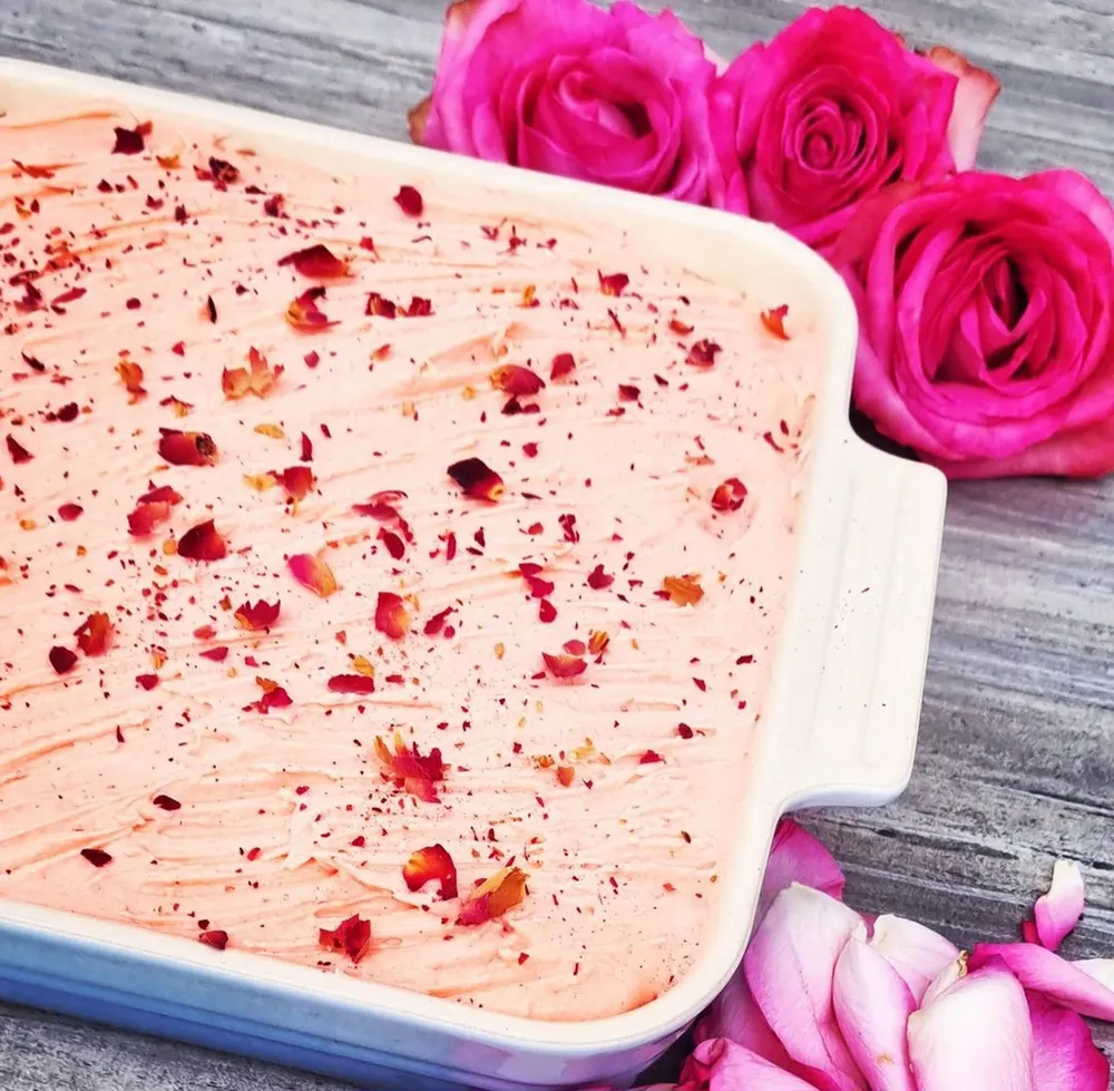 Once cake is cool, add the icing and sprinkle crushed edible rose petals.