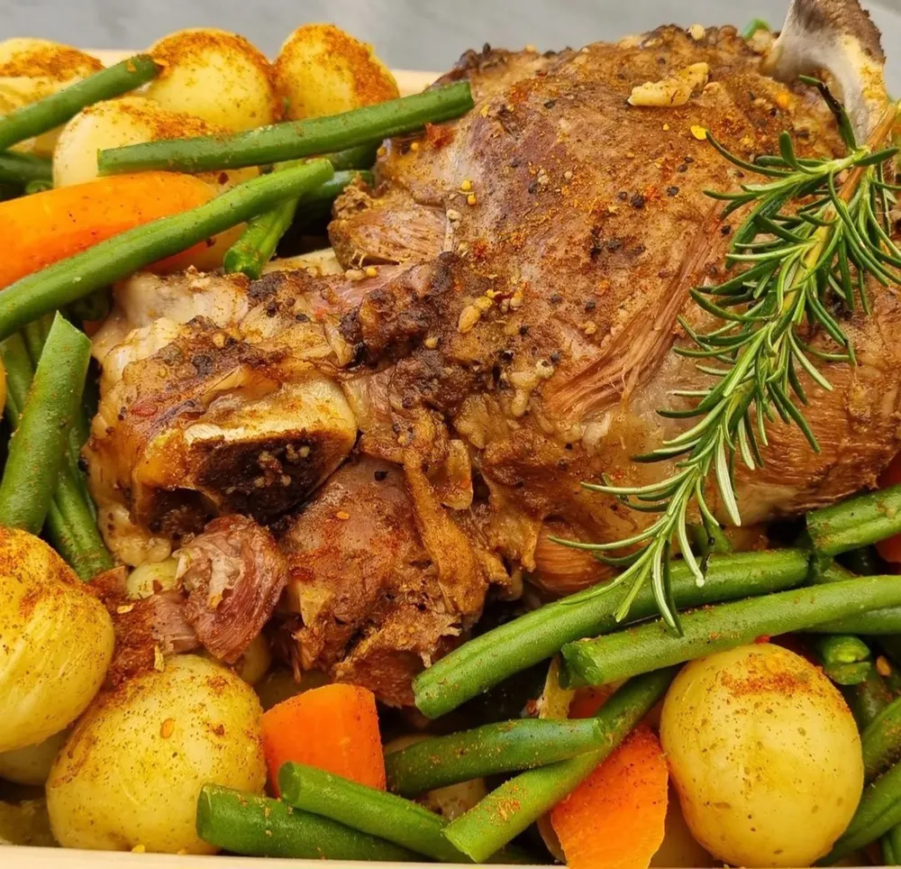 Transfer the leg to a roasting dish and add peeled root vegetables of your choice. Add a sprinkle of Pepper Roast Spice over your vegetables and cover your roasting dish with a double layer of foil.