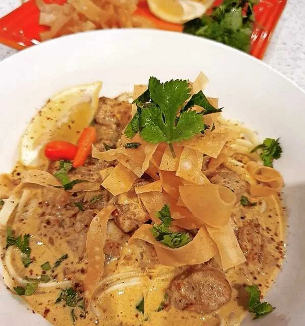Serve on pre-cooked spaghetti and top with fried samoosa pastry and garnish with freshly chopped coriander.