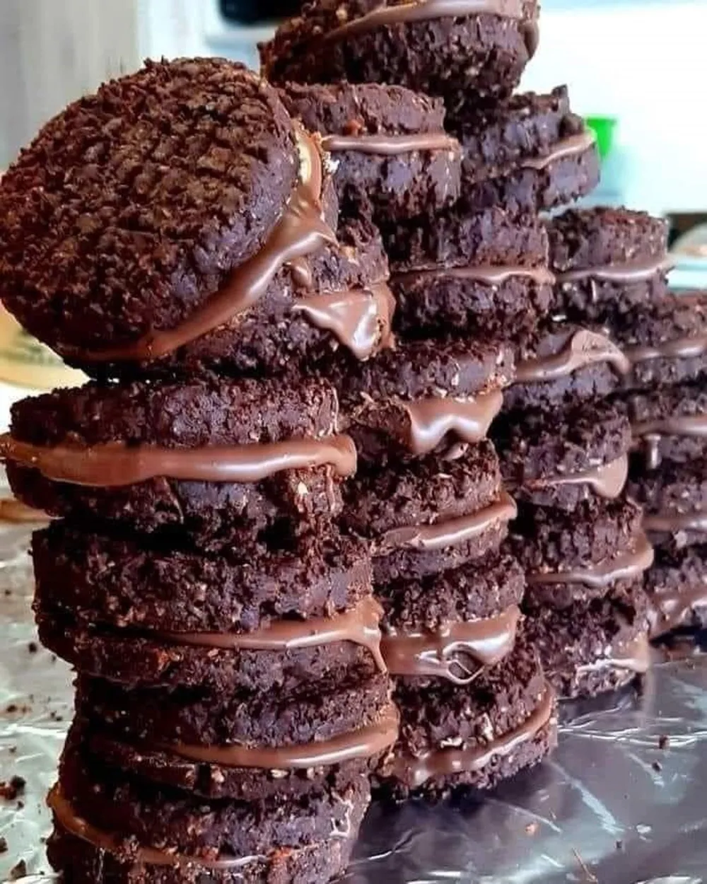 Spoon the chocolate on top of the biscuit and wait for the chocolate to be half set before lightly placing the top biscuit on top. Press gently.