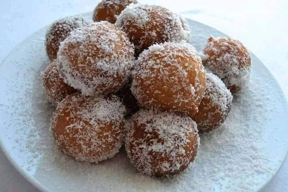 Dunk the bollas into the warm syrup just once and remove with a slotted spoon. Sprinkle with desiccated coconut and serve.