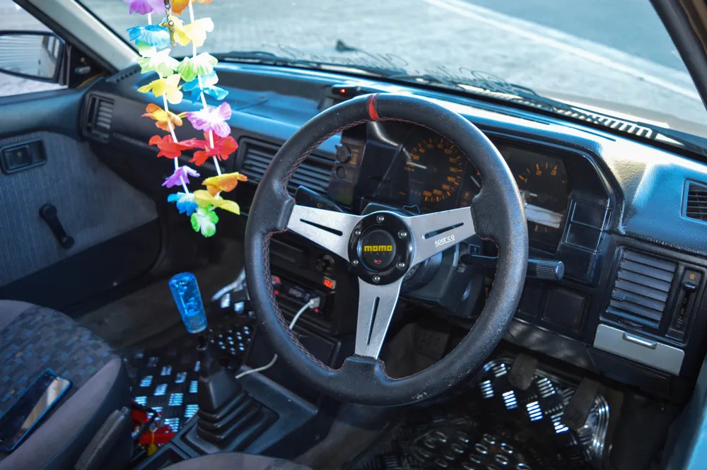 Ethan didn’t get seats, his are the original 1995 ones. But he did manage to score other parts of the interior from a Mazda 2 000 model that he is busy recovering in vinyl. The centre console comes from a 200i 16-valve, while the instrument cluster is from a 160 EGI.