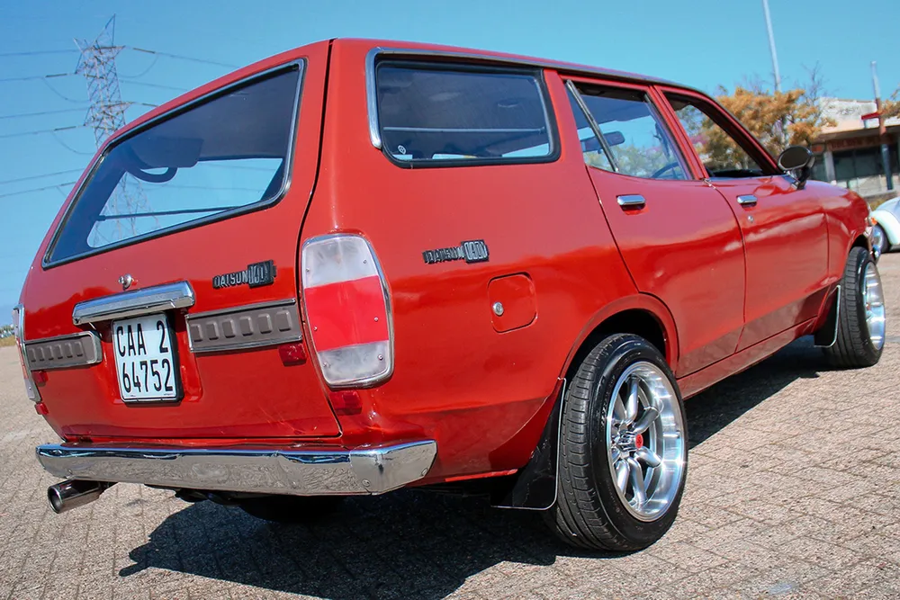 It’s a 1976 Datsun 140Y station wagon, the kind you’d take to the drive-in cinema in the ‘80s, setting the kids up on folding chairs in the back so they could see the screen. Then would come the popcorn, sweets and milkshake.