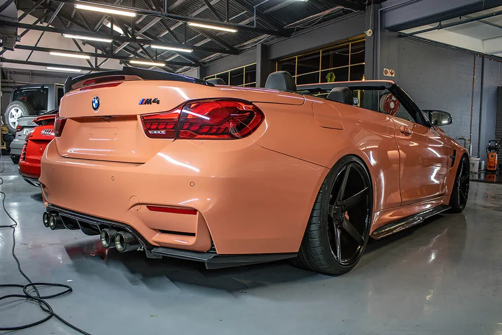 MOOI: Carbon-tipped exhausts for slick finish Natasha Michaels drives off in her newly vinyl spray wrapped M4. Pictures: Adeeb Davids of MAD Worx