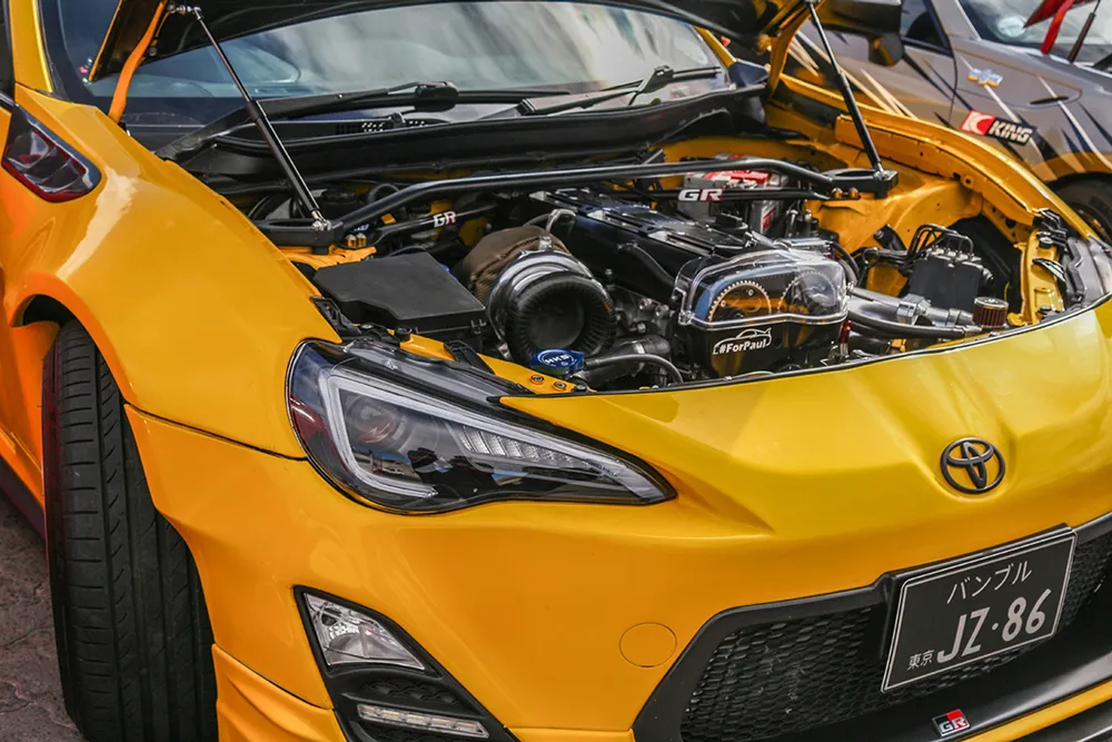 The exterior got the full treatment, starting with the yellow spray job “so everyone knows that’s Waseem’s 2jz 86,” the body kit, custom splitter, TRD V2 side skirts and rear bumper, WRX wing, carbon fibre mirror covers and RBG underglow.