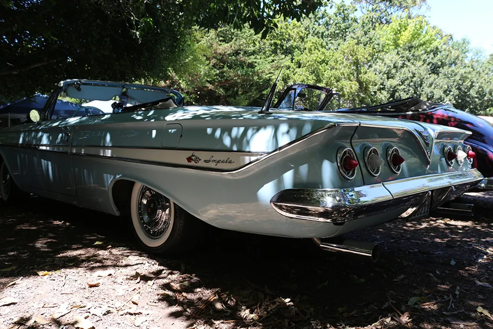 Settled nicely into the dappled shade, the sky blue 1961 Chevrolet Impala was a presence, like that one person in the room who everybody wants to talk to but who doesn’t seem to mind either way.