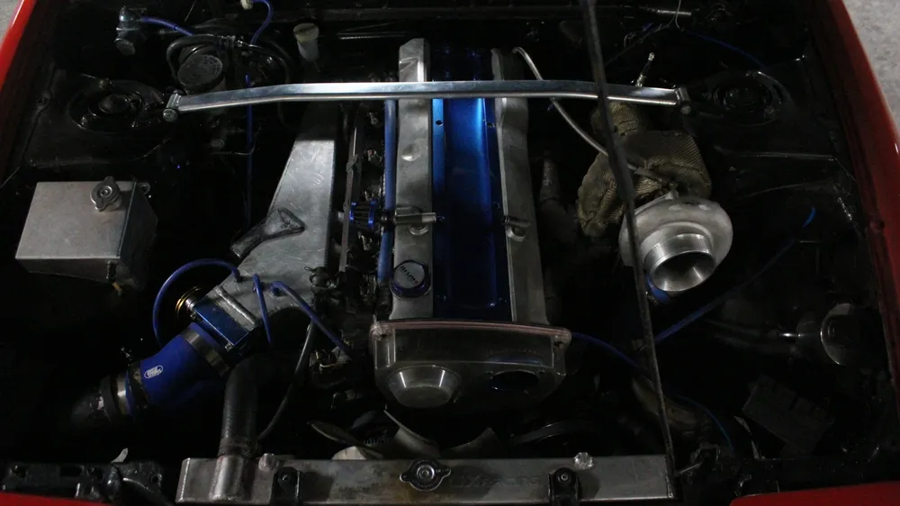 What makes his 200sx stand out, he says, is that it’s the only knew he knows of fitted with a tilt and slide sunroof. It’s under the hood that the action takes place, though.