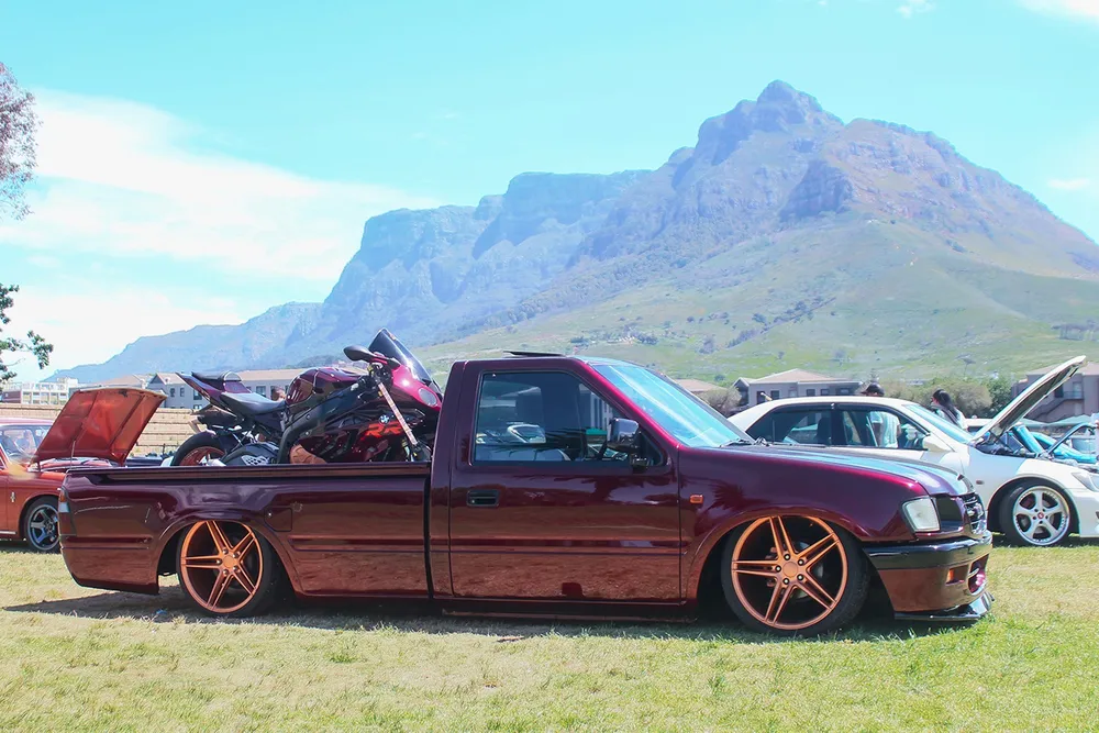 Last year Abdul Aziz’s candy apple red Lexus-powered V8 Isuzu bakkie was a crowd pleaser. This year it returned, with matching BMW RR superbike on board, but this time sporting a deeper ox-blood red and slammed on air-suspension.