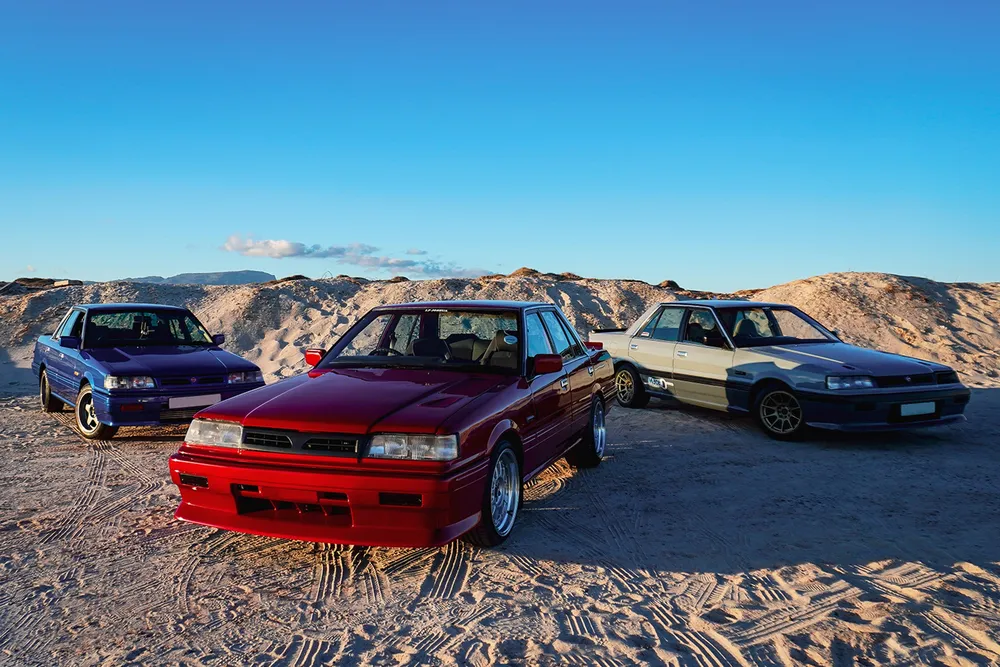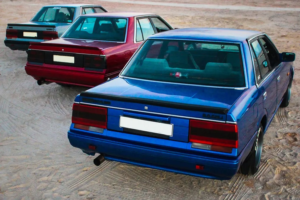 All three cars in the pictures are 1987 Nissan Skylines. The blue one has stock Nissan RB25 details for his son, Ricardo. The grey car has a Nissan L28 from the old Skyline 2.8l GTX, and it has an added turbocharger. The red one has a Nissan VK45, V8 motor, also turbocharged.