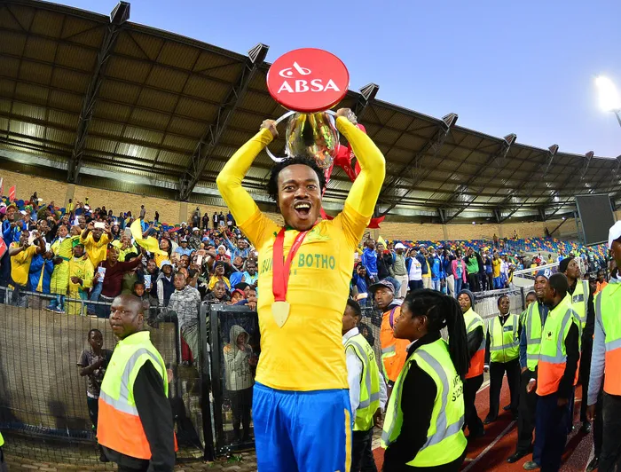 Percy Tau celebrates with the ABSA Premiership trophy after Saturday's match against Blomefontein Celtic. Photo: Samuel Shivambu/BackpagePix Percy Tau celebrates with the ABSA Premiership trophy after Saturday's match against Blomefontein Celtic. Photo: Samuel Shivambu/BackpagePix
