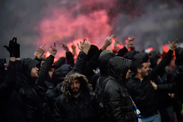 UNREST: Olympique de Marseille's followers shout slogans against Athletic Bilbao's fans before the Europa League round of 16, 2nd leg, match between Athletic Bilbao and Olympique Marseille, at San Mames stadium, in Bilbao, northern Spain, Thursday, March 15, 2018. Photo: Alvaro Barrientos/AP UNREST: Olympique de Marseille's followers shout slogans against Athletic Bilbao's fans before the Europa League round of 16, 2nd leg, match between Athletic Bilbao and Olympique Marseille, at San Mames stadium, in Bilbao, northern Spain, Thursday, March 15, 2018. Photo: Alvaro Barrientos/AP