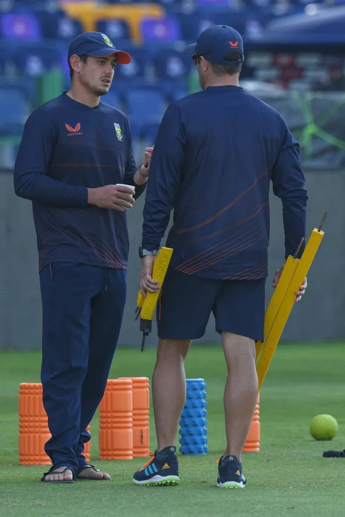 South Africa's Quinton de Kock chats with coach Mark Boucher during a training session ahead of the ICC men's T20 World Cup cricket match against Australia. Photo: Indranil Mukherjee/AFP
