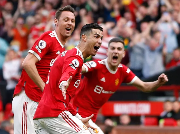 Manchester United's Cristiano Ronaldo celebrates after scoring the wiining goal during their Premier League game against Norwich City at Old Trafford on Saturday.