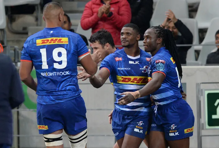 Stormers fullback Warrick Gelant celebrates his try against Leinster with Seabelo Senatla and Salmaan Moerat.