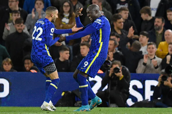 Chelsea's Romelu Lukaku (R) celebrates with Hakim Ziyech (L) after scoring their third goal against Leeds United.