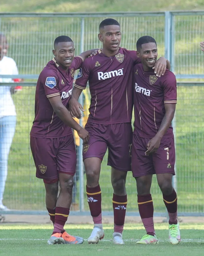 Jayden Adams of Stellenbosch FC celebrates with team-mates after scoring their second goal during their DStv Premiership game against Mamelodi Sundowns at Tuks Stadium in Tshwane on Saturday.