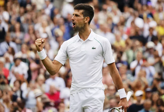 Novak Djokovic celebrates winning the men's quarter final match against Jannik Sinner at the Wimbledon.
