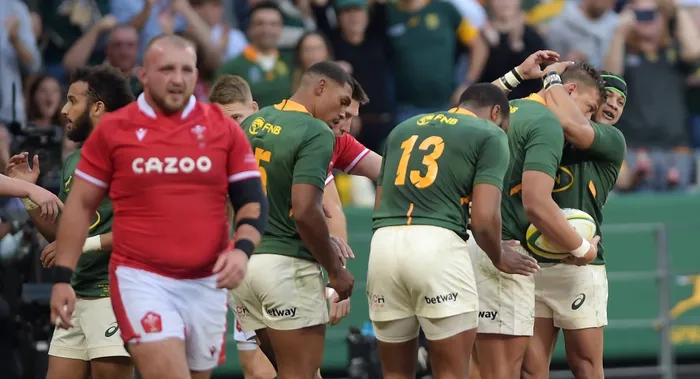 The Springboks celebrate Handre Pollard’s try during the third Test against Wales at Cape Town Stadium in Cape Town on Saturday.