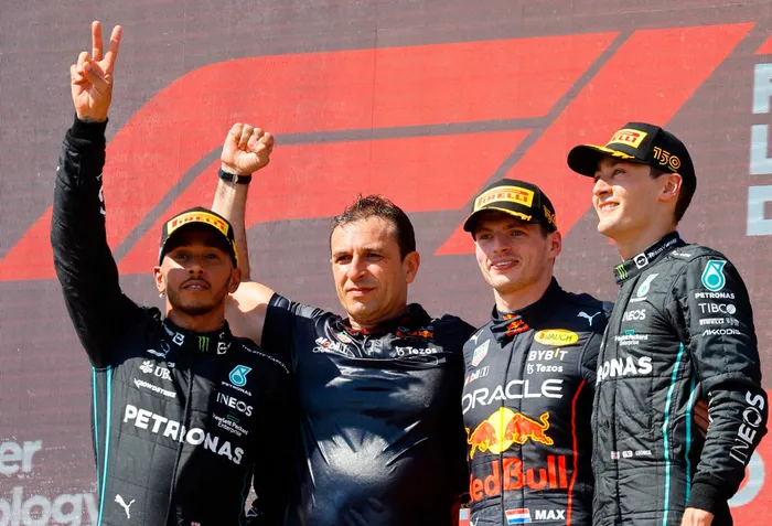 Hamilton, in his 300th GP, had jumped Sergio Perez in the other Red Bull, from fourth to third with a brilliant start, before Russell hunted down Perez with four laps to go as he caught the Mexican sleeping at a restart following a virtual safety car.