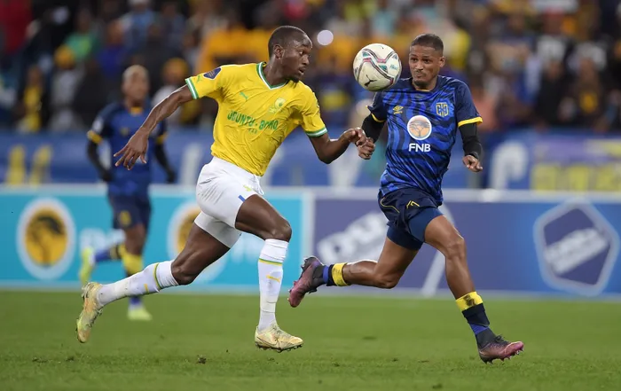 By this time, the game was crying out for a goal, and on the hour mark Sundowns played their set-piece card with great effect after City defender Keanu Cupido was blown up for a foul some 10 metres out from the penalty area. Sundowns fullback Aubrey Modiba stepped up with a curling free-kick over the ball and past the unsighted Marques for the opening goal of the match.
