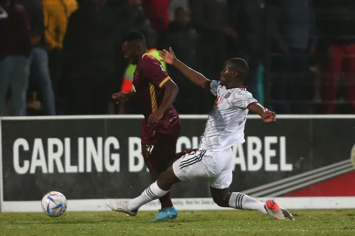 Sinethemba Mthobisi Mngomezulu of Stellenbosch FC is tackled by Tapelo Xoki of Orlando Pirates during their DStv Premiership match at Danie Craven Stadium in Stellenbosch on Wednesday.