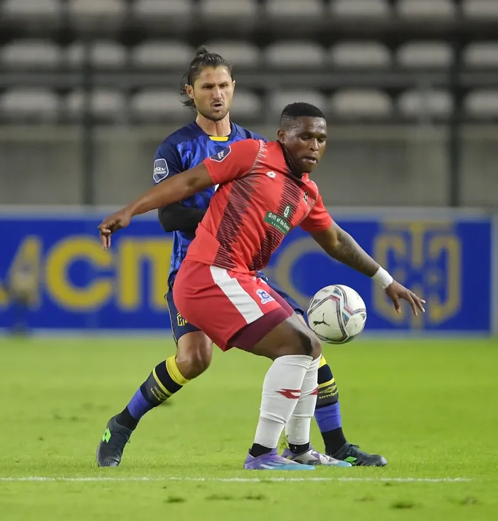 Maritzburg United’s Lelethu Skelem is challenged by Marco van Heerden of Cape Town City during their DStv Premiership game at Athlone Stadium in Cape Town on Tuesday.