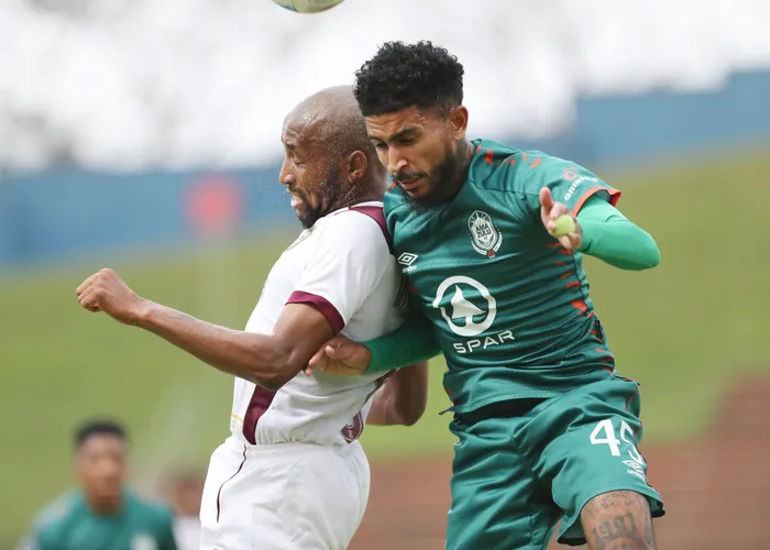 Keagan Buchanan goes up for a header against Sihle Nduli at the King Zwelithini Stadium on Sunday.