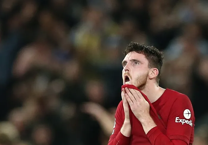 a soccer player reacts with disappointment on his face Liverpool's Andrew Robertson reacts after the English Premier League soccer match against Leeds United in Liverpool, Britain, 29 October 2022.