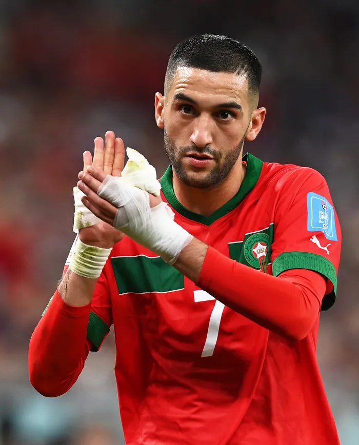 Hakim Ziyech of Morocco applauds fans as he leaves the pitch during the FIFA World Cup 2022 quarter-final Hakim Ziyech of Morocco applauds fans as he leaves the pitch during the FIFA World Cup 2022 quarter-final against Portugal at Al Thumama Stadium in Doha, Qatar, 10 December 2022. Picture: Georgi Licovski/EPA