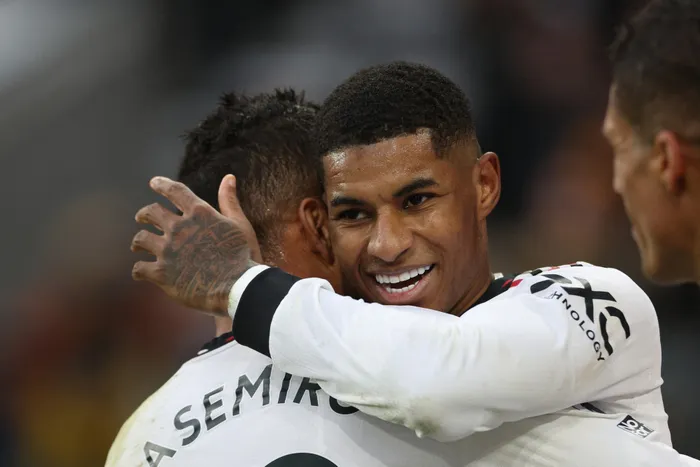 Manchester United's Marcus Rashford celebrates with Casemiro during Saturday’s Premier League clash against Wolverhampton Wanderers at the Molineux Stadium in Wolverhampton Manchester United's Marcus Rashford celebrates with Casemiro during Saturday’s Premier League clash against Wolverhampton Wanderers at the Molineux Stadium in Wolverhampton. Photo: Adrian Dennis/AFP
