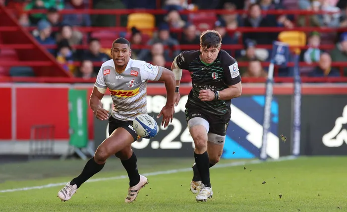 Damian Willemse of the Stormers, and Benhard Janse van Rensburg of London Irish chase the ball during Sunday’s Champions Cup match at The Gtech Community Stadium in London. Photo: Danny Loo/PPAUK
