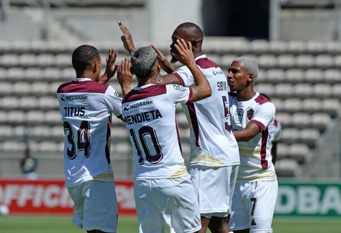 Vusi Sibiya of Stellenbosch FC celebrates with teammates after scoring a goal during their Nedbank Cup game against Swallows FC at Athlone Stadium in Cape Town on Saturday. Photo: Ryan Wilkisky/BackpagePix