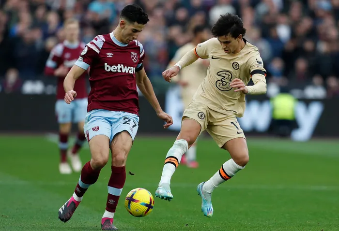 West Ham United's Nayef Aguerd and Chelsea's Joao Felix vie for the ball during their Premier League football match at the London Stadium in London on Saturday. Photo: Ian Kington/AFP