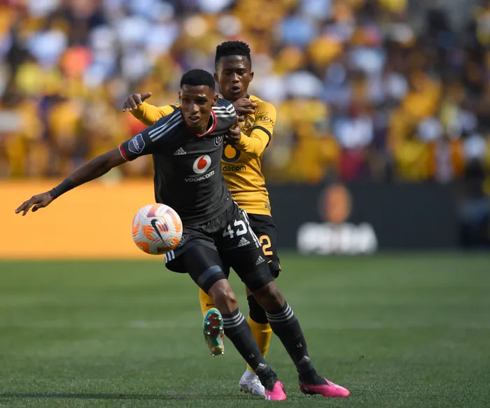 Orlando Pirates’ Vincent Pule and Mduduzi Shabalala of Kaizer Chiefs fight for the ball during their DStv Premiership match at FNB Stadium in Soweto, Johannesburg on Saturday. Photo: Sydney Mahlangu/BackpagePix