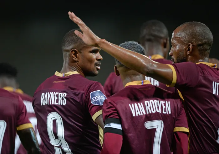 Stellenbosch FC’s Iqraam Reyners celebrates with teammates after scoring a goal during their DStv Premiership match against AmaZulu at Danie Craven Stadium on Friday. Photo: Ryan Wilkisky/BackpagePix