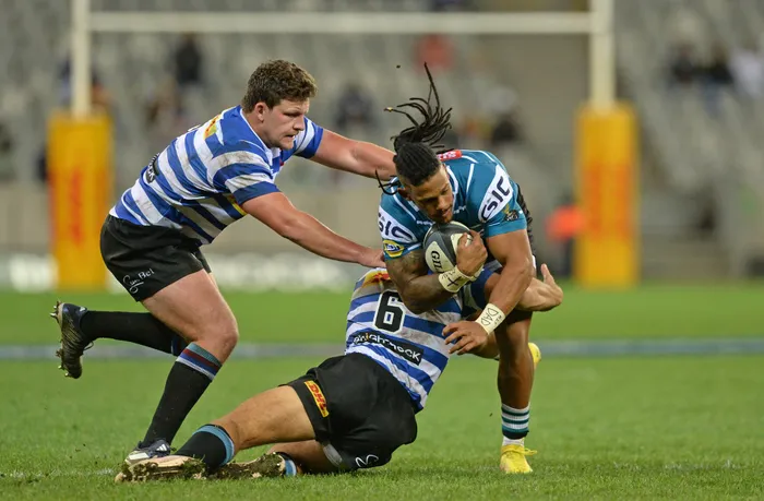 Reagan Oranje of Griquas is tackled by Paul de Villiers and Andre-Hugo Venter of Western Province during their Currie Cup game at Cape Town Stadium on Saturday. Photo: Ryan Wilkisky/BackpagePix