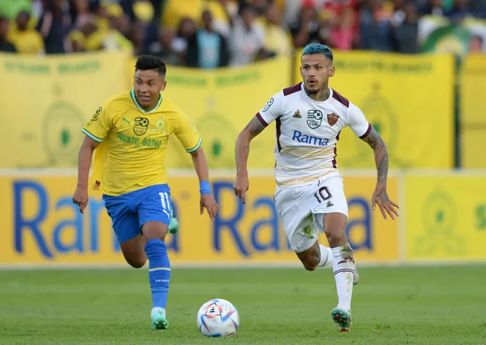 Junior Leandro Mendieta of Stellenbosch FC is challenged by Marcelo Allende of Mamelodi Sundowns during their Nedbank Cup quarter-final game at Athlone Stadium in Cape Town on Saturday. Photo: Ryan Wilkisky/BackpagePix