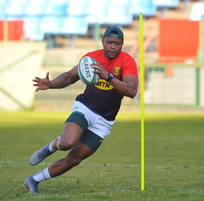 Aphiwe Dyantyi during the Springboks Training on 1 July 2019 at Loftus Versfeld Stadium Springbok winger Aphiwe Dyantyi is officially back on the rugby field with the Sharks after his four-year suspension for doping. Picture: Sydney Mahlangu/ BackpagePix