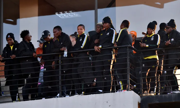 Banyana Banayana players stand on a balcony. Banyana Players were reported barred from entering stadium where a makeshift team played against Botswana. Sydney Mahlangu/BackpagePix