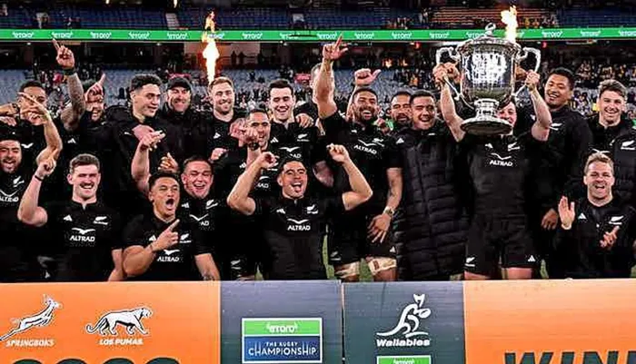 The All Blacks stormed to a 38-7 win over a sore and sorry Australia on Saturday to seal a third consecutive Rugby Championship title.