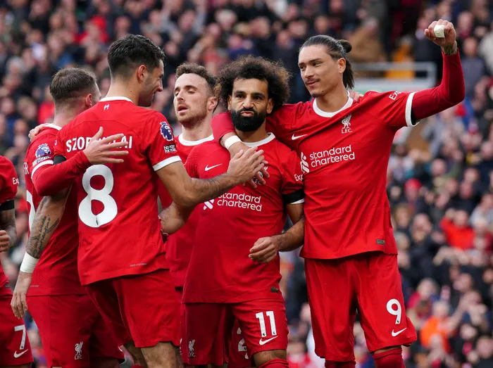 After sukkelling to break down the 10-man Toffees’ taai defence, the breakthrough came in the 75th minute when Luis Diaz’s cross hit Michael Keane’s outstretched arm and Salah converted from the penalty spot.